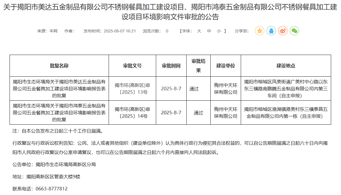 2025年8月7日,揭陽市生態(tài)環(huán)境局高新區(qū)分局就2個(gè)不銹鋼餐具加工建設(shè)項(xiàng)目環(huán)境影響報(bào)告表作出審批通過并對(duì)外進(jìn)行公告,公告期:自本公告發(fā)布之日起三十個(gè)工作日屆滿。