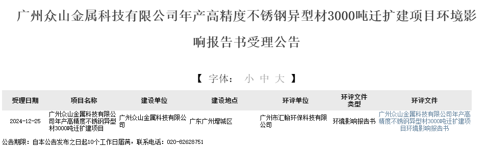 2024年12月25日,廣州市生態(tài)環(huán)境局受理廣州眾山金屬科技有限公司年產(chǎn)高精度不銹鋼異型材3000噸遷擴(kuò)建項(xiàng)目環(huán)境影響報(bào)告書并對(duì)外進(jìn)行公告,公告期:10個(gè)工作日。